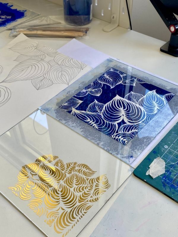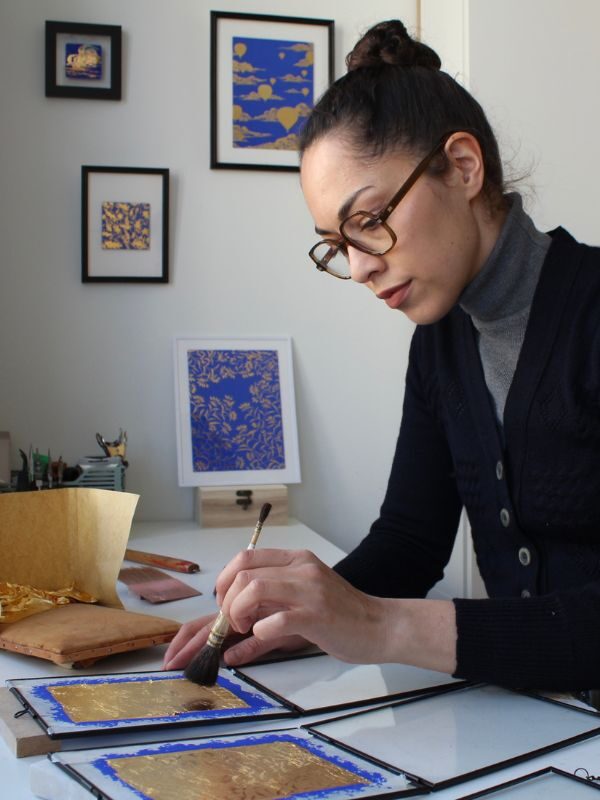 Je conçois et réalise mes tableaux en verre églomisé entièrement moi-même, dans mon atelier lillois. Chaque tableau est unique et toujours conçu comme un objet de contemplation et de rêverie.